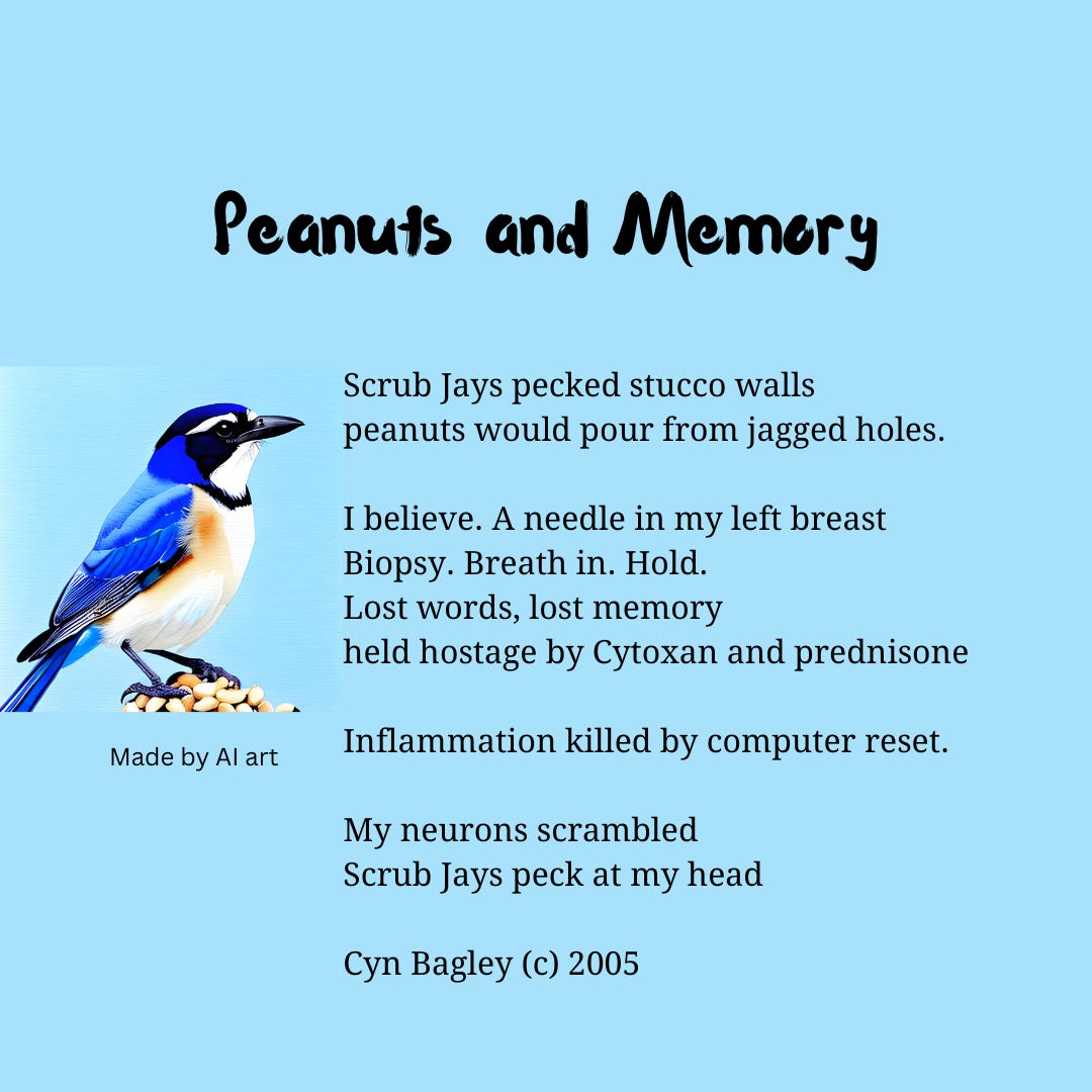 Author note: I was on IV Cytoxan for a year and the oral form cychlophosphamide for 6 months. Sometimes during those times my memories would scramble. Even now since I have been off an immunosuppressant for a year and prednisone for three or more years, I had a hard time remembering when certain things happened. Considering that I always had a good memory before, it was very hard to know that the medication that saved me also scrambled a lot of my talents. It was hard to keep moving one step forward no matter what was thrown at me.
